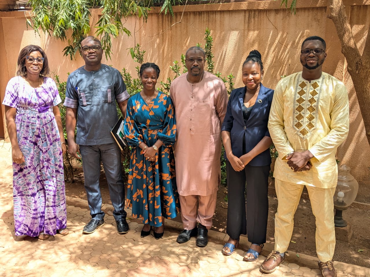Innovations for Poverty Action (IPA) and Development Media International (DMI) staff photographed at the DMI country office in Ouagadougou, Burkina Faso in May 2025. From left to right: Mireille Belem, Director of Research, DMI Burkina Faso; Achille Tchibozo, former Research Manager, IPA Burkina Faso; Maud Amon-Tanoh, Country Director, IPA Francophone West Africa (FWA); Bassirou Kagone, Country Director, DMI Burkina Faso; Fatimata Barro, former Project Development Analyst, IPA FWA; and Abdoulahi Boris Traore, Business Development and Program Associate, IPA FWA. © 2025 DMI
