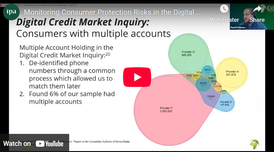 In this webinar, Daniel Putman (IPA) introduced a practical toolkit for using this data for digital credit market monitoring. Drawing on examples from a collaboration with the Competition Authority of Kenya, the toolkit covers the nuts and bolts of leveraging this data—from requesting data to analysis and interpretation of outcomes. He was joined during the webinar by Kevin Mutiso (Digital Lenders Association of Kenya) and Christine Hougaard (Cenfri) to discuss how new market monitoring tools can have a real impact on consumers’ financial health.