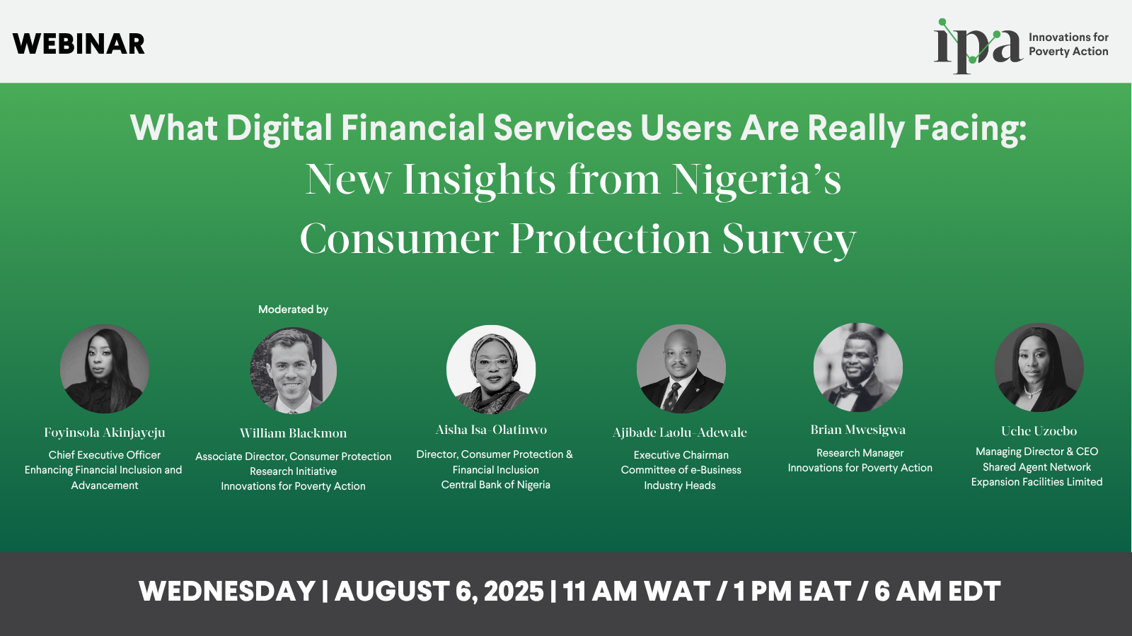 On August 6, 2025, Innovations for Poverty Action (IPA) hosted a webinar to discuss key insights from our Nigerian Consumer Protection in Digital Financial Services Survey with IPA’s Brian Mwesigwa and William Blackmon. The survey, a follow-up to the 2020 Nigeria Consumer Protection Survey, took a deep dive into how Nigerians are using DFS, the challenges they face, and how they seek redress. The webinar concluded with a panel discussion featuring Ms. Foyinsola Akinjayeju (Enhancing Financial Inclusion and Advancement), Dr. Aisha Isa-Olatinwo (Central Bank of Nigeria), Mr. Ajibade Laolu-Adewale (Committee of e-Business Industry Heads), and Mrs. Uche Uzoebo (Shared Agent Network Expansion Facilities Limited).